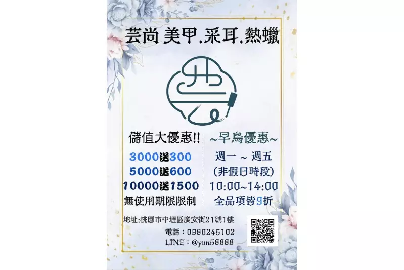 位於桃園中壢的「芸尚 美甲•采耳•熱蠟」,是一間融合專業技術與身心靈療癒的美學空間。店主人擁有多年美業經驗,曾任專業講師,如今親自創業,將過去的技術積累與服務熱情,化為一家溫馨且高品質的個人工作室,為每一位顧客帶來專屬的美與放鬆體驗。
